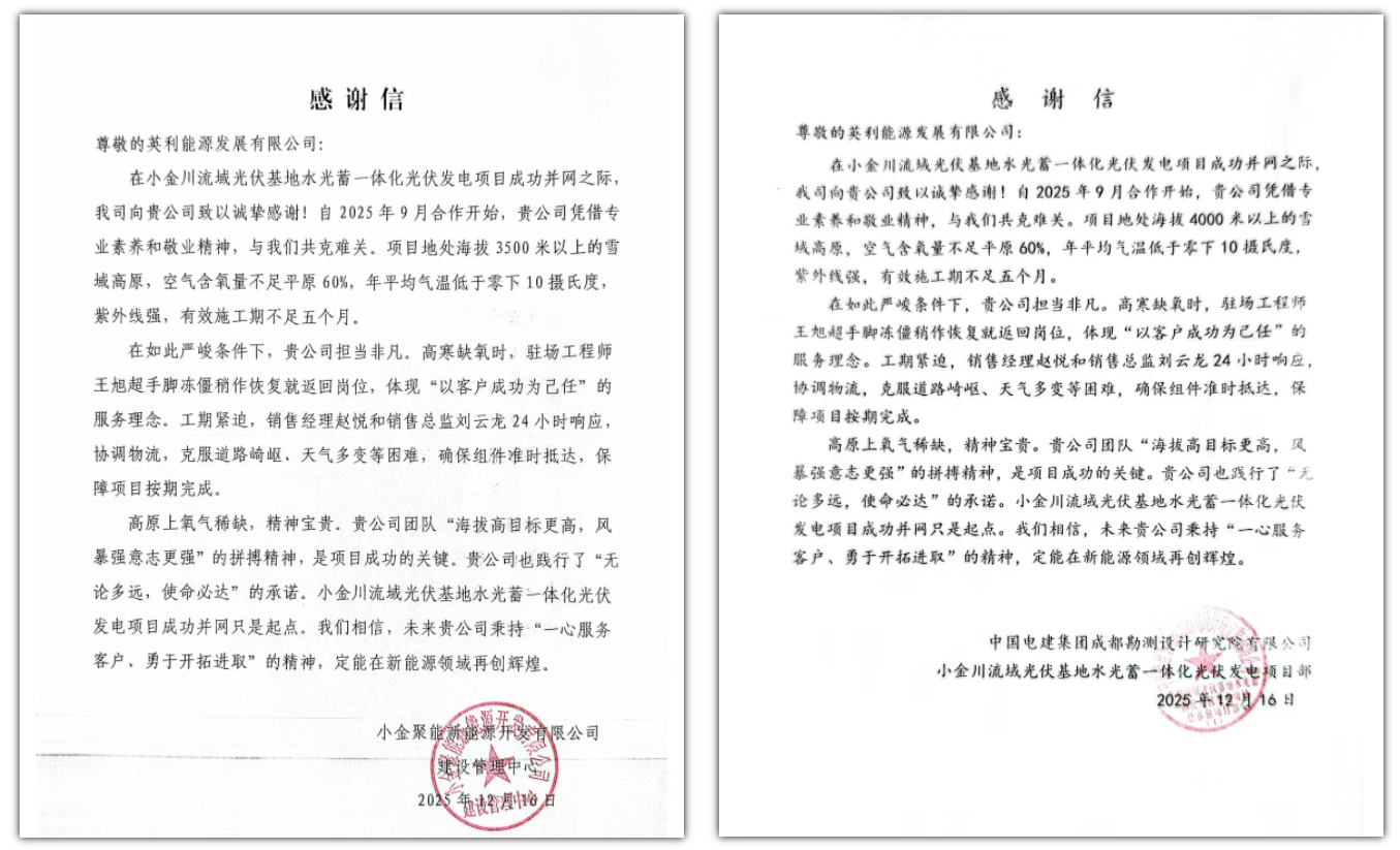 优质产品和高效服务也获得客户高度认可。项目业主方小金聚能新能源开发有限公司、项目总包方中国电建旗下中电建水电开发集团有限公司均发来表扬信;业主更赠送一面锦旗以示高度赞誉:“光伏履约守诚信 精工筑品显担当”。